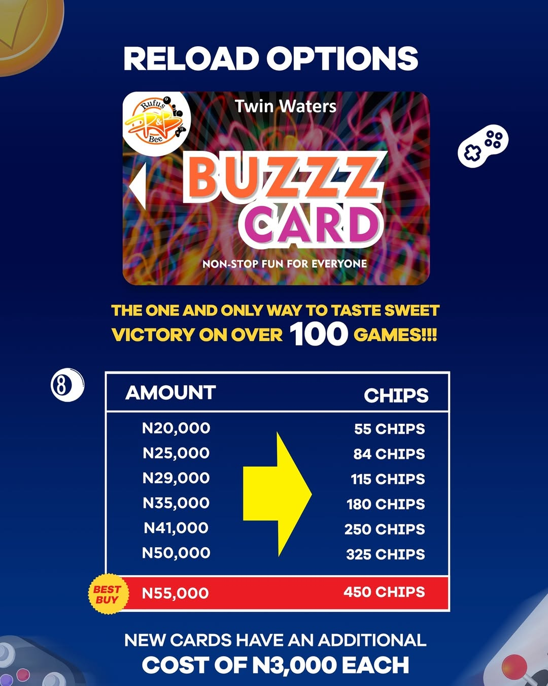 Get a buzz card, Load chips in it at the front desk and proceed to tap on your game choice and play.