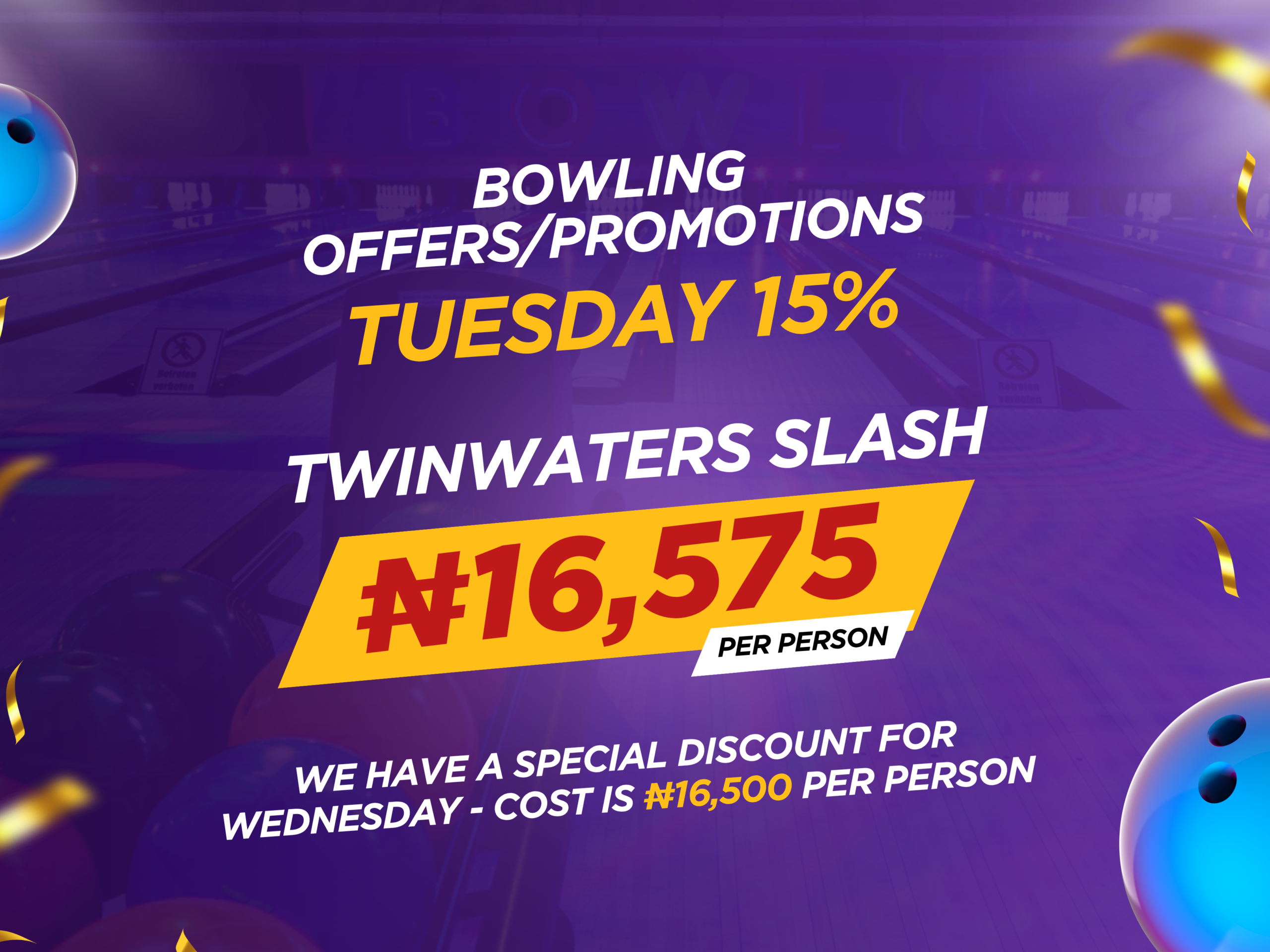 Bowling Offers/Promotions: Tuesday 15% TWINWATERS Slash- ₦16,575 per person